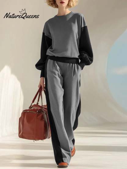 Women's Color Block Crew Neck Long Sleeve Casual Loose Sweatshirt High Waist Casual Wide Leg Pants Set