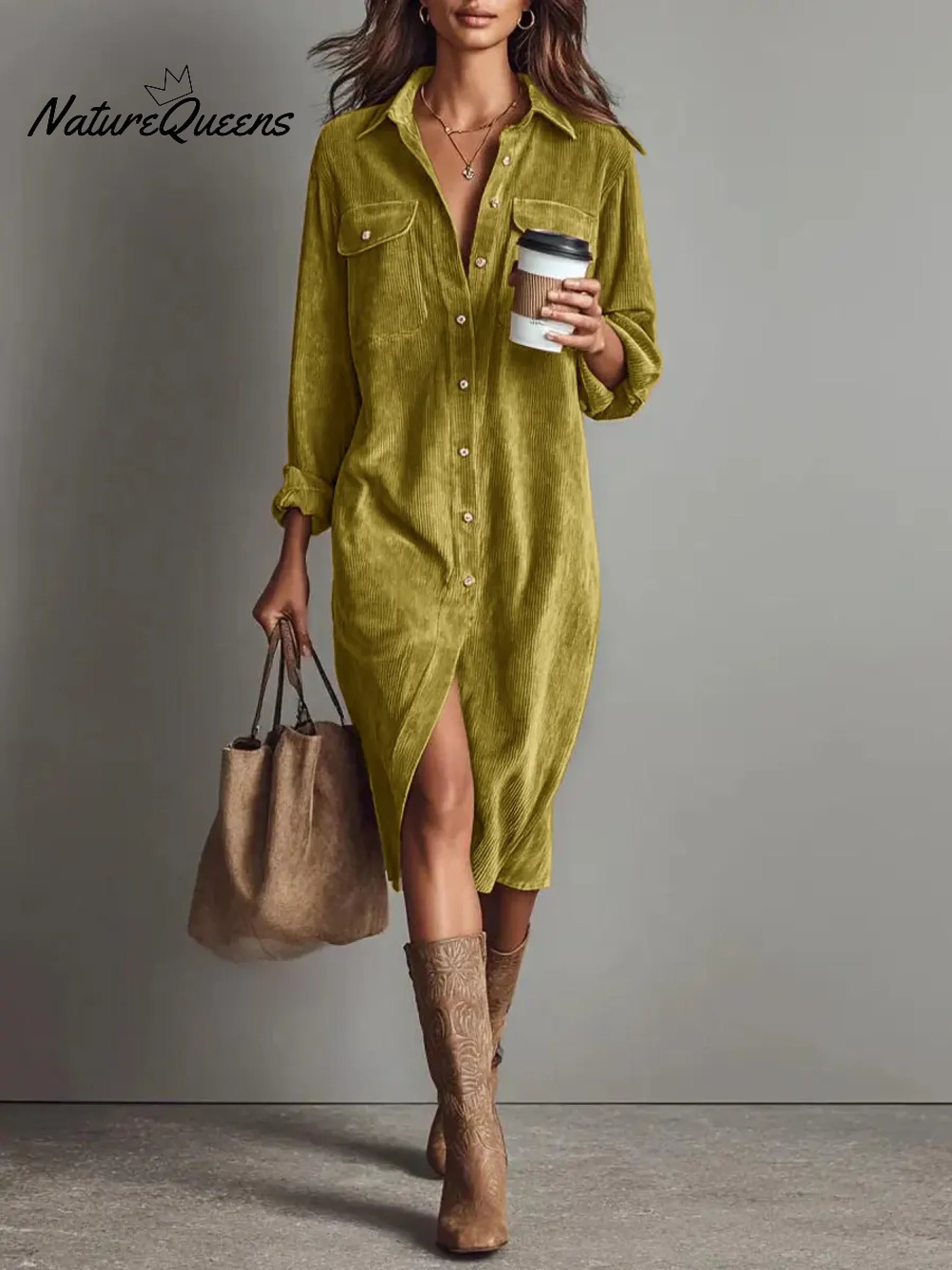 Women's Solid Color Collared Long Sleeve Casual Loose Corduroy Shirt Dress